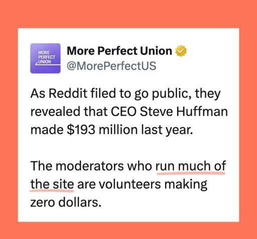 So what, give the CEO half and pay the rest to the mods? Like 1300 bucks per year without tax and fees. What would be left? 50 bucks per month? Reddit has like 75000 moderators. Some for huge Subreddits, some for small ones. Equal pay? Or what?