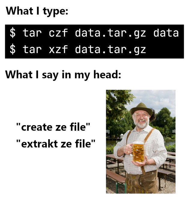 minus-squareSalix@sh.itjust.workslinkfedilinkarrow-up5·3 years ago c = create z = use gzip f = file x = extract