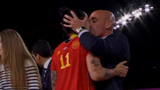 Luis Rubiales is criticised by a Spanish government minister for kissing forward Jenni Hermoso on the lips after Spain’s Women’s World Cup victory.