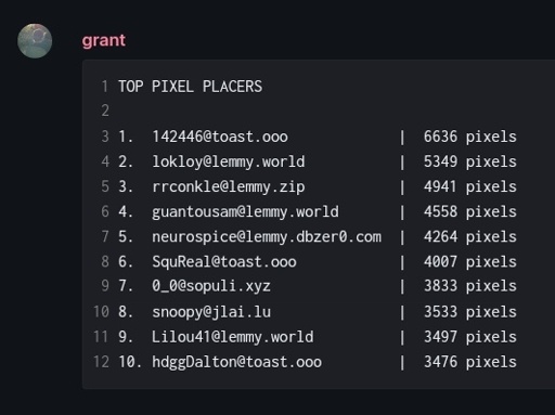 arrow-up130arrow-down1imageTop 10 pixel placers (unofficial-ish from Canvas matrix chat)i.imgur.comu/lukmly013 💾 (lemmy.sdf.org)@lemmy.sdf.org to Canvas@toast.oooEnglish · 2 years agomessage-square19linkfedilinkfile-text