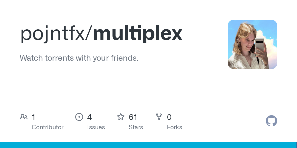 Multiplex, an app to watch torrents together. It provides an experience similar to Apple’s SharePlay and Amazon’s Prime Video Watch Party, except for any torrent instead of a specific streaming service. Thanks to WebRTC, it doesn’t require a server to sync playback, and can use a gateway if a viewer can’t use BitTorrent. It’s written in Go for GNOME; check it out on GitHub https://github.com/pojntfx/multiplex