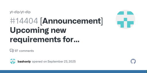 UPDATE: Installing Deno and installing yt-dlp through PyPi fixes yt-dlp but the very idea that Google is mandating JS to lock down YT in an attempt at pseudo-DRM is still crappy.