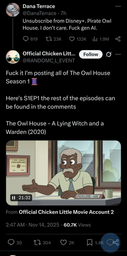 LiamBox@lemmy.ml to Piracy: ꜱᴀɪʟ ᴛʜᴇ ʜɪɢʜ ꜱᴇᴀꜱ@lemmy.dbzer0.comEnglish · 2 months ago'The Owl House’ creator Dana Terrace situation with Disney+ positive views on AI generated contentlemmy.mlimagemessage-square56linkfedilinkarrow-up1473arrow-down14