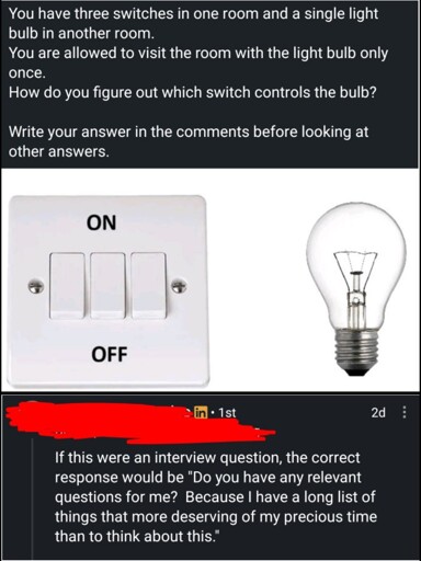 It’s funny to read the reactions and the people not understanding that programming questions are not enough to judge you. We need people with functioning brains and that usually means problem solving skills. And sometimes the problems are fucking idiotic! Nobody cares about the light switches. We want to see how you think. We want people who don’t give up if they can’t look it up.