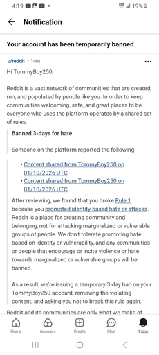 Apparently that was also hate speech. Well, I think at least a few countrymen hated my joke to the point it got reported and annoyed the mods enough.