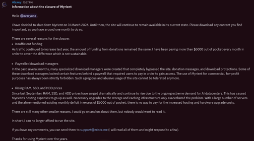 Ugh, a dagger in my heart. That sucks, I really like Myrient. Anyone know what their Discord and/or Telegram channels have to say about this? I don’t have an account for either (nor do I want one).