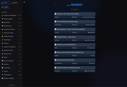 My core idea is to build a task manager that will stay with me for the rest of my life. Because of that, my main requirement is for it to be fast even with a massive database. If I have 10k+ tasks saved over the years, it should still load and feel instant.